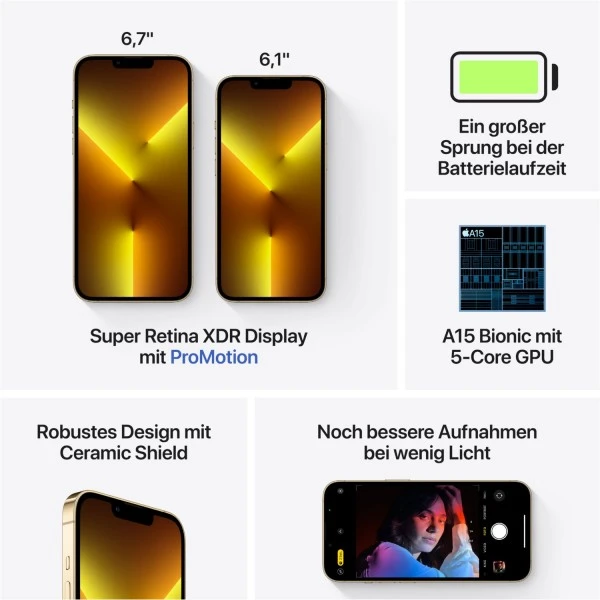 Bei der Größe von 14,67 x 7,15 x 0,77 cm wiegt das Smartphone Apple iPhone 13 Pro (512GB) insgesamt 203 g und wird daher zu den großen Modellen gerechnet. Sie surfen viel im Internet und schauen unterwegs gerne Videos an? Auf dem 6,1 Zoll Multitouch-Display, das 1170 x 2532 Pixel darstellt, ist das problemlos möglich. Hinzu kommt, dass das Apple iPhone 13 Pro (512GB) Smartphone wasserdicht ist verfügt. Mittels LTE, UMTS und WLAN haben Sie mit Ihrem iPhone 13 Pro (512GB) jederzeit InternetzugangKOMMA ob zu Hause oder unterwegs. Dank Bluetooth lässt sich das Smartphone mit Headsets, Fitness-Trackern und anderen Geräten koppeln. NFC ermöglicht eine sichere Übertragung von Daten sowie mobiles Payment. Eine Lightning-Schnittstelle ist zusätzlich eingebaut, um Daten über Kabel zu übertragen. Schöne Momente fangen Sie in Form von Fotos und Videos mit einer hochauflösenden 12 Megapixel-Kamera und einer 12 Megapixel-Frontkamera ein. Viel Platz für Filme, Musiksammlungen und Apps bieten beim Apple iPhone 13 Pro (512GB) 512 GB Speicherplatz. Beim iPhone 13 Pro (512GB) von Apple besonders praktisch ist die kabellose Ladefunktion.